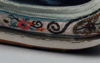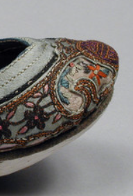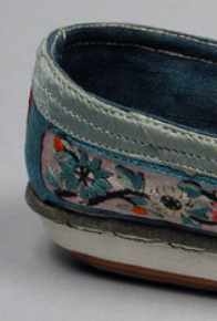 缠足习俗在宋代开始流行,到了清代达到鼎盛。在当时的社会观念中, 女性缠足被视为一种美,认为小巧的 “三寸金莲” 能使女性步态婀娜,符合传统的女性审美标准。 这种习俗不仅影响了民间,在宫廷和贵族阶层中也广泛存在。女性从幼年开始缠足, 而绣花三寸金莲鞋就是为缠足后的小脚专门制作的鞋子,是这一特殊习俗的产物。清代的审美观念深受传统文化的影响,追求细腻、精致、婉约之美。 绣花三寸金莲鞋上精美的刺绣图案,如花卉、鸟兽、吉祥纹样等, 不仅展现了高超的手工艺水平,也符合当时人们对于美的追求。这些精美的绣花装饰, 让原本小巧的鞋子更具观赏性,成为女性服饰搭配中重要的一部分, 体现了女性的温婉与柔美。