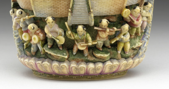 本品规格为11.11 x 6.03 x 5.08 厘米。画面雕刻 “数十孩童”(俗称 “百子图” 变体 ),场景为 “宫廷戏台 + 庭院游乐”—— 上层 “亭台内,仕女观戏、乐师奏乐”(暗合 “皇家宴饮” ),中层 “孩童击鼓、弹琴、舞蹈”(展现 “太平盛世,孩童无忧” ),底层 “莲瓣托举,寓意‘莲生贵子’”。