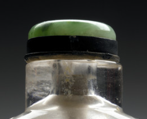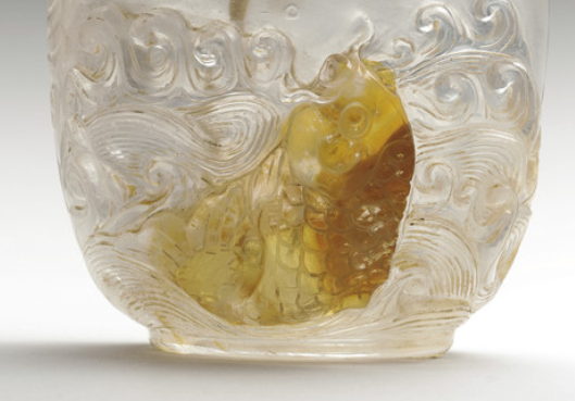 清代宫廷对工艺品极为重视,内务府造办处汇聚了全国顶尖的能工巧匠,负责制作各类精美器物供皇室使用。鼻烟壶作为一种精致的工艺品,深受皇室贵族喜爱。皇帝常将精美的鼻烟壶赏赐给大臣、外国使节等,以彰显皇恩浩荡和皇家的尊贵品味。宫廷对水晶雕鱼藻纹鼻烟壶这类精美器物的推崇,带动了社会上层对鼻烟壶的追捧,使其成为身份和地位的象征,引领了鼻烟壶制作和收藏的风尚。