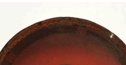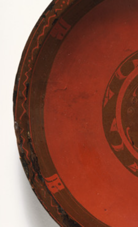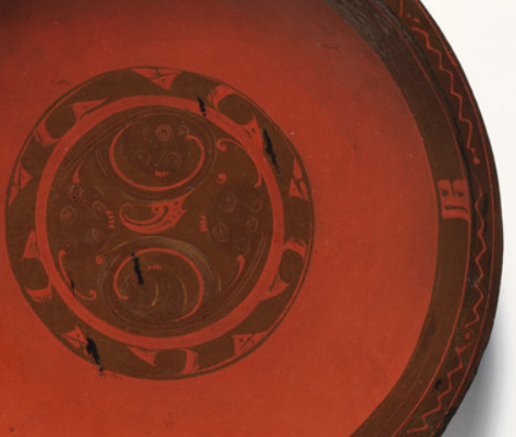 本品直径为21.59厘米。圆形浅盘,敞口、弧壁、平底,器型规整,符合汉代漆盘实用与审美结合的设计。盘心以褐漆绘云气纹,线条婉转流动,如云雾缭绕,是汉代装饰的典型符号,暗含升仙、祥瑞寓意。
