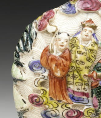 清代是中国制瓷工艺的鼎盛时期,尤其是康乾盛世,御窑厂集中了全国最优秀的工匠,在技术上不断创新,烧造出了品质极高的瓷器。粉彩作为一种新兴的瓷器装饰技法,在康熙晚期出现,雍正时期逐渐成熟,乾隆时期达到鼎盛。 粉彩以其色彩丰富、粉润柔和的特点,深受人们喜爱。同时,浮雕技法在瓷器上的运用也愈发娴熟,能够塑造出立体感强、生动逼真的图案。成熟的粉彩和浮雕工艺,为制作精美的粉彩浮雕八仙纹鼻烟壶提供了技术支撑。