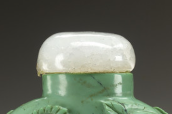 本品规格为5.08 x 3.18 x 1.91 厘米。以温润的绿松石为材质,整体呈清新雅致的浅绿色,间杂天然纹理,尽显古朴韵味。壶身采用镂雕工艺,细腻刻画出花鸟、花卉与枝叶,构图精巧,花朵绽放、鸟儿栖息,层次分明,生动展现自然意趣。搭配白色玉石质地壶盖,色泽对比和谐,凸显精致。造型小巧规整,工艺精湛,将实用功能与艺术审美融合,是清代鼻烟壶中兼具材质美与工艺美的珍品 。