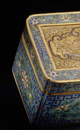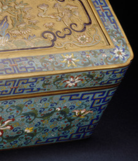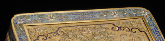 本品规格为15.24 x 33.02 x 18.42 厘米。长方体盒型,规整端庄,盖与身严丝合缝,体现实用性与仪式感,是清代宫廷文房或陈设的典型器型。采用掐丝珐琅(景泰蓝) 工艺,以铜为胎,经 “制胎 - 掐丝 - 点蓝 - 烧蓝 - 打磨 - 鎏金” 多道工序。铜丝掐成花卉、回纹等图案,嵌入胎体后填烧珐琅釉料,最后鎏金提亮,工艺繁复精湛。