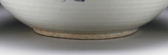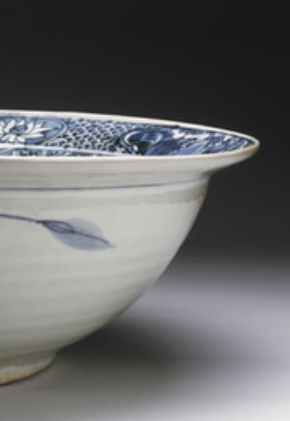 本品直径为47.63厘米。碗为折沿敞口(口沿外折,便于端拿、盛放 )、弧腹圈足,造型规整,口沿内侧绘连续花卉纹 + 锦地纹(图案密集,色彩浓郁 ),外壁绘折枝花卉纹(线条疏朗,青花发色沉稳 )。