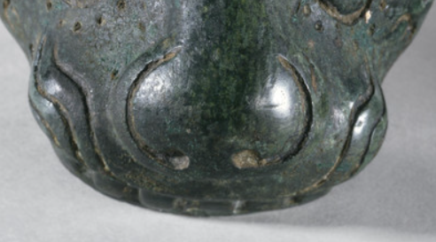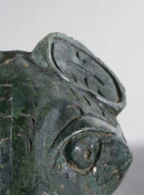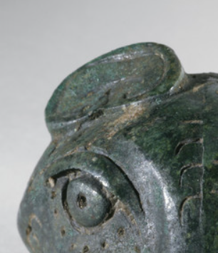 本品规格为5.72*5.08厘米。整体塑造虎首形态,双眼圆凸(眼珠有穿孔,可能原嵌贝或其他材质 ),鼻吻宽阔,嘴部隐于下方;额头有阴刻条纹(模拟虎纹 ),耳部呈 “扁圆耳 + 耳面纹饰”(耳面似有兽面纹 ),将虎的凶猛与商代 “神秘化” 艺术处理结合,既写实又具符号化特征。