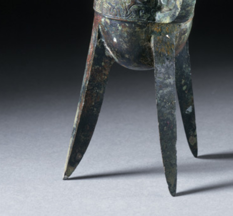 本品规格为18.42 x 15.24 x 9.53 厘米。由流、尾、柱、腹、鋬(pàn,把手 )、足六部分构成 —— 流(前伸的倒酒槽 )与尾(后翘的平衡部 )对称,口沿立双菌柱(可能用于挂滤网 ),腹部微鼓,一侧设兽首鋬,下接三棱锥足(空心或实心,此为实心 ),是商代爵的标准形态。腹部以兽面纹(饕餮纹 ) 为主题,线条勾连出双目、鼻梁、兽角,周边辅以雷纹地子(细密回纹 ),柱顶、流尾、足部也有简化纹饰,体现商代 “以纹载神” 的装饰逻辑。