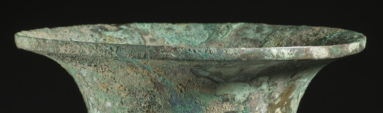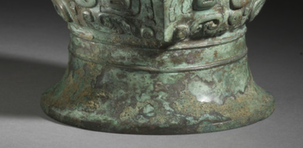 本品规格为19.69 x 18.42 厘米。典型商周 “尊” 制 —— 敞口外撇、束颈收窄、鼓腹圆润、高圈足外撇,比例端庄,符合 “礼器以器型明等级” 的规制(用于祭祀、宴饮,彰显身份 )。青铜铸造,表面因岁月形成绿锈层(铜与空气、水反应生成碱式碳酸铜等),既见证千年埋藏历史,又增添古朴厚重感。