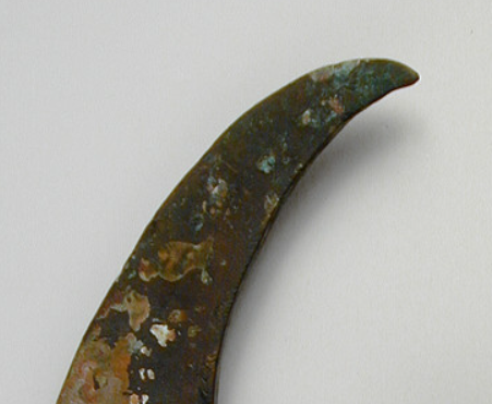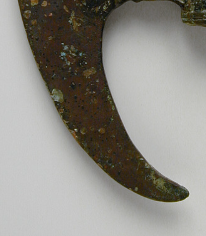 本品规格为20.32 x 12.06 厘米。整体呈不对称月牙形,由宽阔弧刃与兽首銎(装柄部位 )两部分构成。弧刃线条流畅,外撇弧度大,恰似弯月;兽首銎部造型复杂,以高浮雕、阴刻等工艺,塑造出兽面特征—— 双眼圆凸、鼻梁高挺,纹理勾勒出獠牙、额纹,头顶还设有穿系绳带的小穿孔,兼具实用与装饰性。