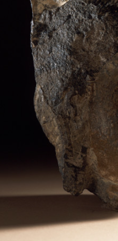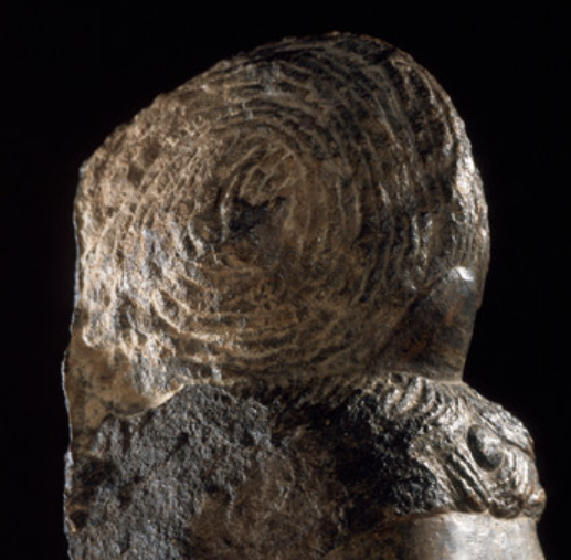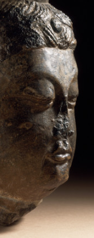本品高度为25.4厘米。佛头保留高髻样式(顶部残损但可见螺旋纹雕刻 ),发髻饱满,体现唐代佛像 “高发髻、显庄严” 的造型规范;额间发际线清晰,有涡旋状纹理,展现发丝的层次感。脸型丰腴圆润(唐代佛像典型特征 ),双目微阖(眼睑线条柔和 ),嘴角含隐笑,传递 “慈悲、宁静” 的佛性,符合唐代 “以形写神、神韵兼备” 的造像理念。