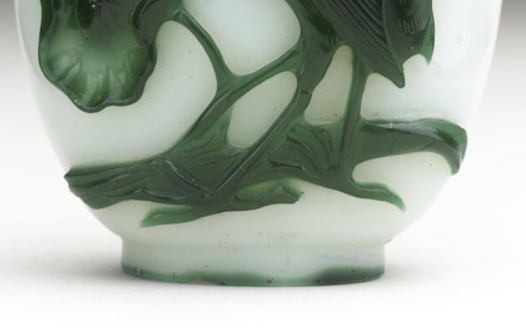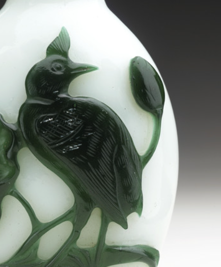 清代的玻璃制作工艺取得了显著进步,套料工艺逐渐成熟。套料工艺是在一种颜色的玻璃胎上,套上其他颜色的玻璃层,然后通过雕刻等手法,展现出不同颜色的层次和图案。白地套绿料鼻烟壶就是套料工艺的典型代表,工匠们能够精准地控制玻璃的颜色和厚度,将白色和绿色巧妙结合,通过雕刻花鸟纹饰,使鼻烟壶呈现出独特的艺术效果。