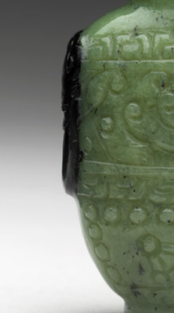本品规格为整体4.45 x .64 x 2.22 厘米,盖子1.59 x 1.91 厘米,瓶子3.81 x .64 x 2.22 厘米。以碧玉为材,色泽青绿,带自然墨斑。盖顶嵌异色玉,配金属饰边。壶身浮雕兽面纹,两侧设辅首耳,古朴庄重。工艺上,玉雕细腻,纹饰规整,将玉石质地与传统纹样、辅首造型融合,尽显古典雅致韵味。