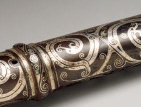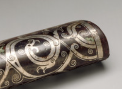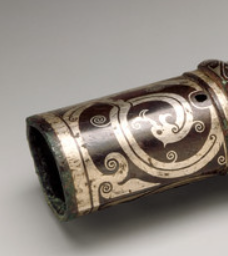 本品规格为16.83 x 3.81 x 2.86 厘米。以青铜为胎,运用错银工艺,将银嵌入青铜表面,形成流畅的蟠螭纹等图案。银与青铜的色泽对比鲜明,纹饰细腻,工艺精湛呈长管状,有分段设计,可能为戈柄的装饰套。规整的形制与精巧的分段,既符合实用功能(保护、装饰戈柄 ),又体现造型设计的匠心。