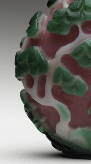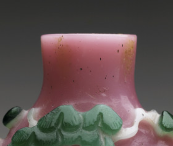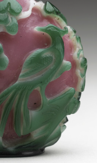 本品规格为5.08 x 4.45 x 2.54 厘米。以粉色玻璃为胎体,通过套料工艺,融入绿、白玻璃层。雕琢出松树、禽鸟图案,色彩层次分明,粉色温润,绿白鲜活。造型小巧,工艺精巧,将玻璃材质特性与套料、雕刻技艺结合,呈现出别致的花鸟景致。