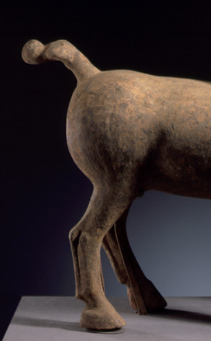 本品规格为94 x 30.5 x 72.4 厘米。以陶土为原料,整体呈现古朴的土褐色,历经岁月沉淀尽显厚重质感。造型上,马的体态矫健,昂首嘶鸣,肌肉线条流畅,四蹄姿态生动,仿佛正蓄势待发,展现出汉代陶塑艺术对马匹神韵与力量的精湛把握。