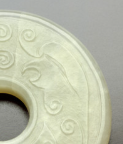本品规格为.64 x 5.08 厘米。这件卷云纹玉璧,整体造型规整,呈标准的圆形,中间圆孔匀称,比例协调 。其玉质温润细腻,色泽柔和,泛出淡雅的米白色,给人一种含蓄内敛的美感。