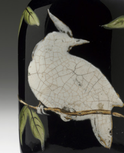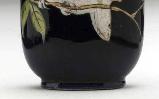 本品高度为6.7厘米,宽度3.3厘米。壶身以粉彩工艺装饰,白鸟栖息于枝头,鸟身有自然开片纹理,增添古朴韵味;身旁衬以翠绿叶片、棕褐枝蔓,色彩搭配和谐。花鸟图案生动,白鸟形态逼真,枝叶细腻,在墨地衬托下尤为醒目。