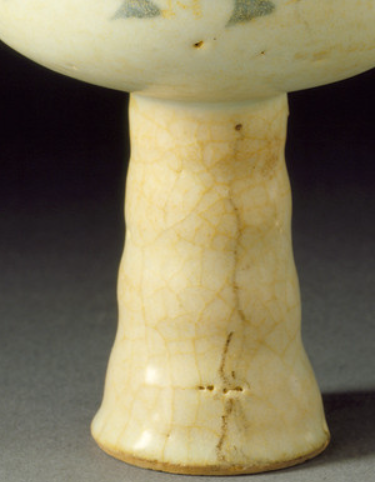 本品高度为9厘米,直径为9厘米。呈高足杯形态,杯身敞口、弧腹,下接竹节状高足,造型端庄又具灵动感,既方便持握,又有较高观赏性,杯身施白釉,以青花绘饰。口沿饰连续回纹,腹部绘缠枝花卉纹,花朵枝叶舒展,青花发色古朴,虽有晕散却添自然韵味,缠枝纹象征生生不息,饱含美好寓意 。