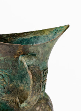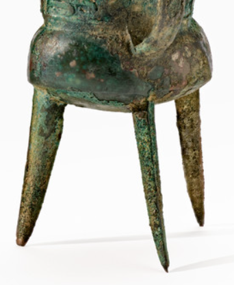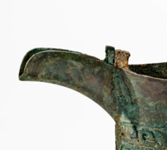 本品规格为14.29 x 13.97 x 7.3 厘米。为典型商周酒礼器,三足鼎立,流(倾倒口)、尾(平衡端)分明,一侧设鋬(把手),器身分段,腰部饰有兽面纹等,古朴庄重,符合当时青铜爵的制式规范 。