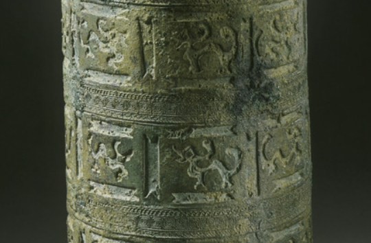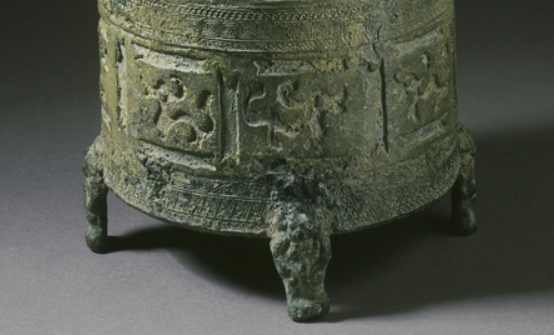 本品规格为23.81 x 13.33 厘米。整体呈直筒形,造型敦实厚重,分器身与三足两部分。器身设三系钮(顶部小耳 ),便于穿绳提携; 表面以多层纹饰带装饰,每层划分矩形开光(独立纹饰区 ),内铸生动的狩猎场景(人物、动物造型 ), 虽因铜锈略显斑驳,但仍可辨识人物张弓射猎、野兽奔逃的动态,还原战国 “田猎” 活动的鲜活画面。三足为兽首形, 增添器物威严感,与狩猎主题呼应(体现对自然、武力的崇尚 )。