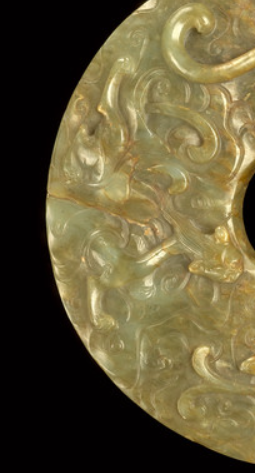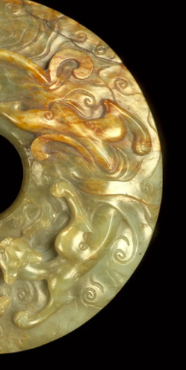 本品规格为1.27 x 12.07 厘米。以青玉为质,呈圆形玉璧形制。表面浮雕螭龙等纹饰,螭龙身形灵动,辅以云纹衬托,线条流畅自然。玉色温润,局部带沁色,增添古朴质感。整体工艺精湛,将螭龙的矫健与神秘展现。