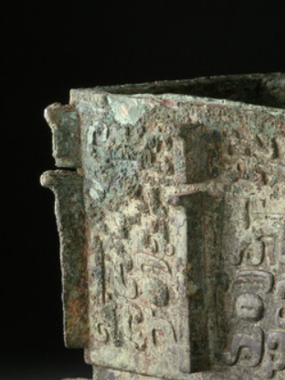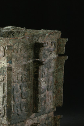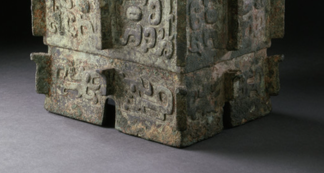本品规格为23.18 x 24.13 x 20.96 厘米。整体呈长方体,造型方正厚重,分器身与圈足两部分。器身四面设出戟(纵向突起装饰 ),增加立体感与威严感; 表面满布浮雕兽面纹、饕餮纹(商代典型纹饰 ),线条粗犷神秘,部分区域因铜锈呈现斑驳质感,还原商代青铜器 “狞厉之美”。 器口敞阔,可容纳酒礼器;圈足有缺口设计(或为固定、排水功能 ),底部与器身纹饰呼应,强化整体庄重感。