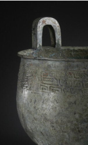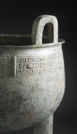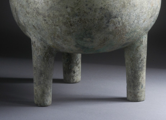 本品规格为23.18 x 19.69 厘米。整体呈圆腹、立耳、柱足造型,分鼎耳、鼎腹、鼎足三部分。立耳为半圆形, 微外撇,便于抬举;鼎腹呈垂鼓形, 口沿外折,腹部饰一周兽面纹(饕餮纹 ) , 以 “鼻梁” 为中轴,对称分布双目、双角, 线条威严神秘;柱足为三棱形, 中空(与腹相通,利于导热 ), 足身素面,简洁庄重。表面因铜锈呈现 “青灰色 - 绿色” 斑驳氧化层, 尽显古朴厚重,兽面纹在锈蚀中若隐若现, 强化神秘威慑感。