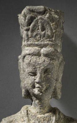本品高度为35.56厘米。菩萨头戴高冠,冠上有简洁纹饰,面容虽经岁月侵蚀仍可辨,神态宁静;身着袈裟,衣纹雕刻质朴,依身形自然分布,展现出垂坠质感;呈交脚坐姿(一腿盘坐、一腿下垂或双腿交叉),左手、右手做特定手印,传递宗教意蕴。