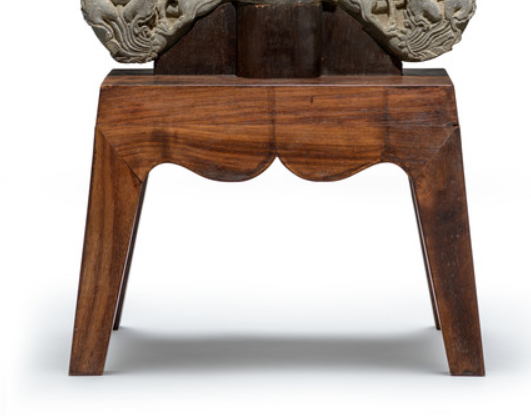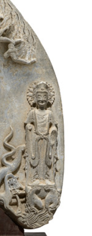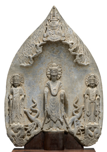 本品规格为52.07 × 38.1 × 10.16 厘米。造像碑为舟形(或火焰形)背光,顶部雕刻神兽等装饰,增添神秘氛围;主尊佛居中,头戴宝冠,面相慈祥,身着长袍,衣纹流畅,姿态端庄;两侧胁侍菩萨分立,造型对称,同样头戴冠饰,身姿修长,衣饰规整。佛与菩萨身侧雕刻龙形等神兽,丰富画面层次,凸显造像的神圣与威严。