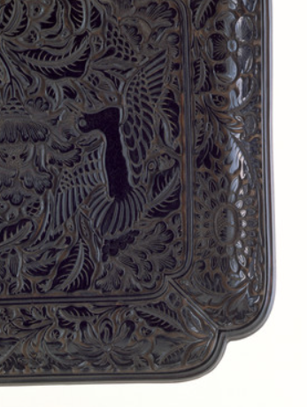 本品规格为3.81 x 27.94 x 27.94 厘米。以黑色漆层为底,采用剔黑技法雕刻。盘面主体是双凤穿梭于花卉间的图案,凤鸟羽翼舒展、形态灵动,花卉枝叶缠绕、纹理细腻。盘边也有精致纹饰,整体造型规整,雕刻立体生动。