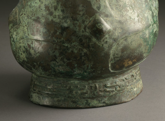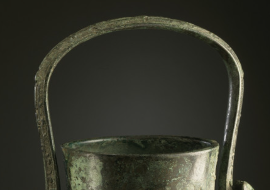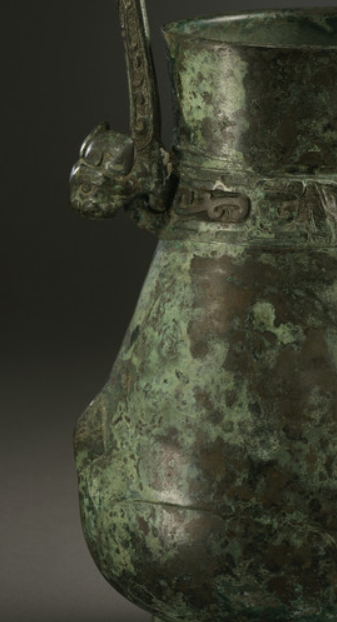 本品规格为34.93 x 17.15 x 15.24 厘米。整体呈束颈、垂腹、圈足造型,分器身、提梁与兽首耳三部分。器身颈部饰一周简化兽面纹(饕餮纹 ) , 以云雷纹为地,线条趋于规整含蓄;提梁为弧形,两端设兽首(羊首 / 牛首 ) 与器身活环衔接, 提梁表面隐现窃曲纹(周代典型纹饰 );腹部有浮雕牺首(兽面突起 ),造型更写实; 圈足饰重环纹(周代常用纹饰 ),与颈部呼应。表面铜锈斑驳,呈现 “青绿色 - 褐色” 自然氧化层, 尽显古朴厚重。
