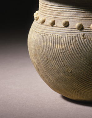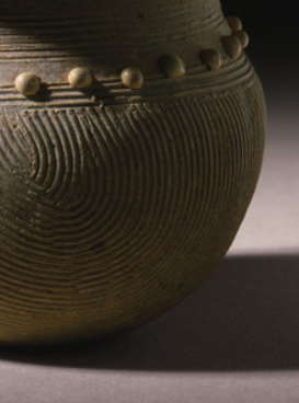 本品规格为7*7.62厘米,整体呈圜底罐形态,口沿外撇、短颈、鼓腹、圜底,造型简洁规整,器身施印纹装饰,颈部有弦纹与乳钉纹相间,腹部为密集的拍印纹路,纹理清晰,富有韵律感。乳钉纹增添器物立体装饰效果。