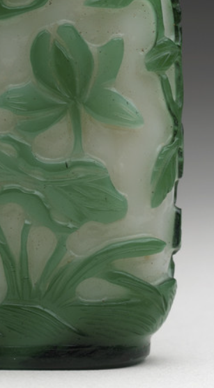 本品高度为6.7厘米,宽度为3.8厘米。以温润玉料为材,主体呈淡雅白色,搭配翠绿浮雕花卉。壶身雕琢荷花、荷叶等图案,叶脉清晰,花朵鲜活,层次丰富,尽显细腻工艺。小口、短颈、扁腹的造型,符合鼻烟壶实用与赏玩兼具的特质,将玉雕技艺与传统花卉题材融合,是兼具艺术价值与文化内涵的精美器物 。