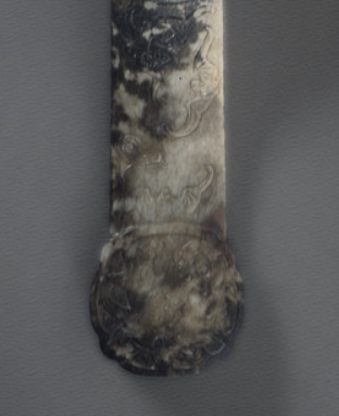 本品规格为43.18 x 12.38 x 5.72 厘米。以玉为材质,呈现出古朴的色泽与纹理。如意头部雕刻有 “寿” 字及缠枝等纹饰,中部则有复杂的吉祥图案,线条细腻,工艺精湛。