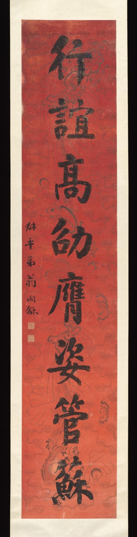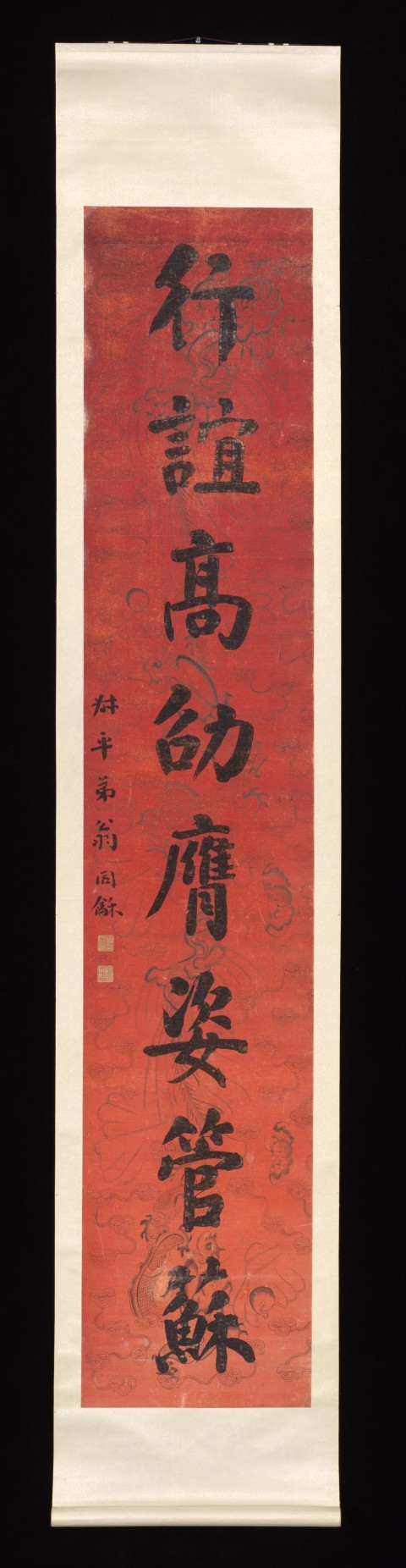 此为清代翁同龢创作的楷书对联轴,属一对悬挂式卷轴,采用红色印刷纸上的水墨画形式。每幅图像尺寸为 235.3×45.4 厘米,整体连裱每幅 290.8×55.9 厘米。翁同龢(1830–1904),字声甫,一字均斋,号叔平,晚号松禅老人,江苏常熟人,是中国近代著名政治家、书法家、收藏家,此联内容为 “体性温仁比踪豹产,行谊高劭赝姿管苏”,题赠 “敬斋二兄世大人”,现藏于美国大都会博物馆。