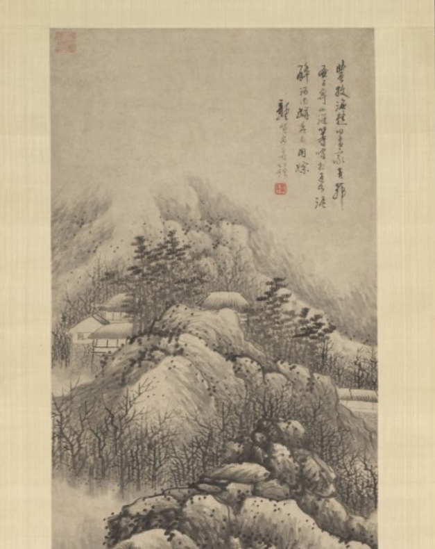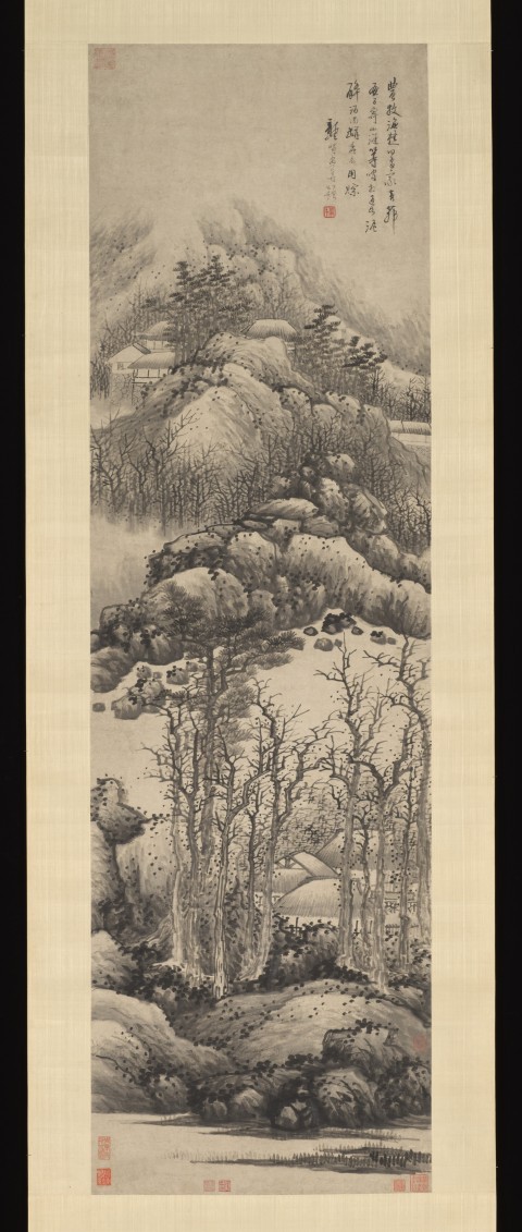此为清代约 1679–1689 年龚贤创作的《冬景山水图》轴,属立轴,采用纸本水墨绘制。图像尺寸为 165.7×48.9 厘米,整体连裱 290.2×67.3 厘米,整体带旋钮 290.2×76.8 厘米。龚贤(1618—1689),又名岂贤,字半千、半亩,号野遗等,江苏昆山人,流寓金陵(今南京),明末清初著名画家,“金陵八家” 之一,擅长通过反复叠加水墨构建高对比度画面,工诗文、善行草。此作以 “冬日的群山” 为主题,绘有山村冬景,配诗赞美乡村生活乐趣,现藏于美国大都会博物馆。