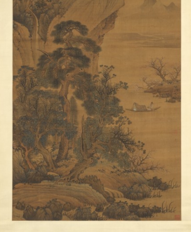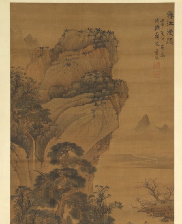 此为明代 1632 年蓝瑛创作的《春江渔隐图》轴(画心),属悬挂式卷轴,以丝绸为材质,采用水墨设色绘制。图像尺寸 184.8×90.8 厘米,整体连裱 250.8×109.5 厘米,整体带旋钮 250.8×117.8 厘米。蓝瑛(1585–1664)为杭州画家,被誉为最后一位浙派专业画家,此作以 “春江隐渔人” 为主题,现藏美国大都会博物馆。