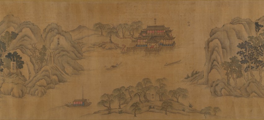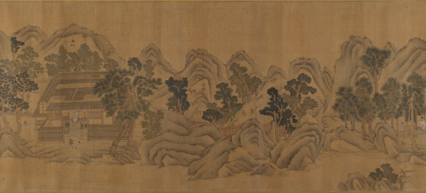 此为明代 16 至 17 世纪佚名画家所作《辋川图》卷,属手卷,以丝绸为材质,采用水墨设色绘制,尺寸 31.8×490.2 厘米,传为郭忠恕临摹王维作品,实际创作者未知,以 “忘川山庄” 为主题,现藏美国大都会博物馆。画作融合王维原作朴素建筑风格与明代文征明追随者的优雅画风,再现辋川庄园景致,是研究古代临仿传统与山水风格演变的实物参考。