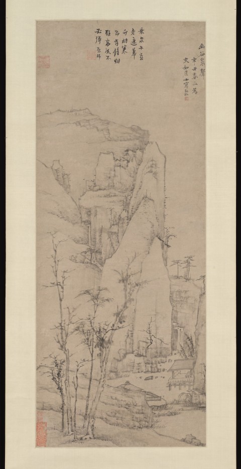 此为清代 1661 年仿弘仁风格的《幽谷泉声图》轴(整体),属立轴,以纸本水墨绘制。图像尺寸 102.9×41 厘米,整体连裱 194.3×55.9 厘米,整体带旋钮 194.3×62.2 厘米,原题为弘仁所作,实际为仿品,作品名 “孤谷春音”,现藏美国大都会博物馆。画面有画家题词及陈述题字,绘细长树木与棱角岩石,受倪瓒风格影响,凸显悬崖宏伟感。