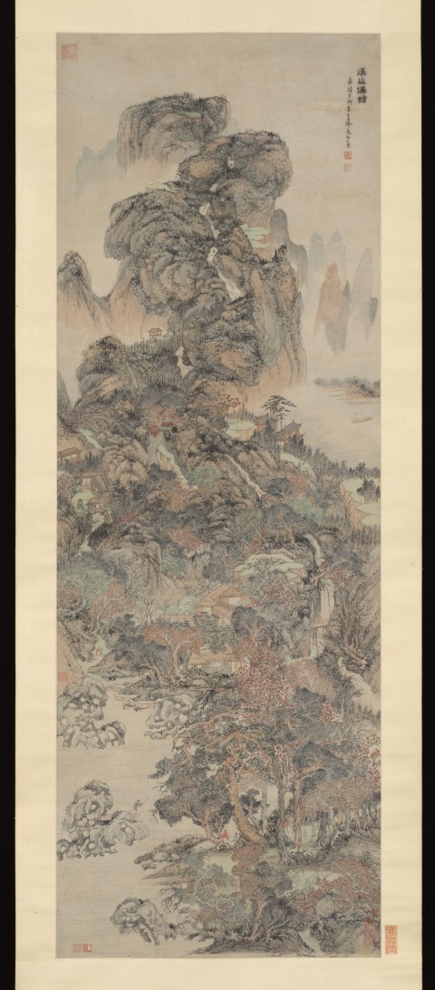 此为明代 1531 年文伯仁创作的《溪山仙馆图》轴,属立轴,以纸本水墨设色绘制。图像尺寸 180.3×63.2 厘米,整体连裱 268.9×79.2 厘米,整体带旋钮 268.9×90.8 厘米。文伯仁(1502–1575),文徵明侄子,明代画家,善山水,此作以 “溪山仙居图” 为主题,现藏美国大都会博物馆。其风格兼具简繁两种面貌,此图体现其繁密构图与清劲笔力,展现山林郁茂之景。