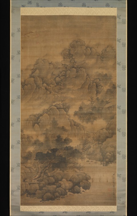 此为清代 1684 年法若真创作的《云山图》轴,属立轴,以丝绸为材质,采用水墨设色绘制,尺寸 137.5×69.5 厘米。法若真(1613-1696),字汉儒,山东胶州人,以奇幻云山题材山水画闻名,此作以 “云山” 为主题,现藏美国大都会博物馆。画面绘翻腾山峦与雾谷树林,用 “三远” 手法构图,兼具垂直动感与深度,是其 72 岁巅峰时期的精湛之作。