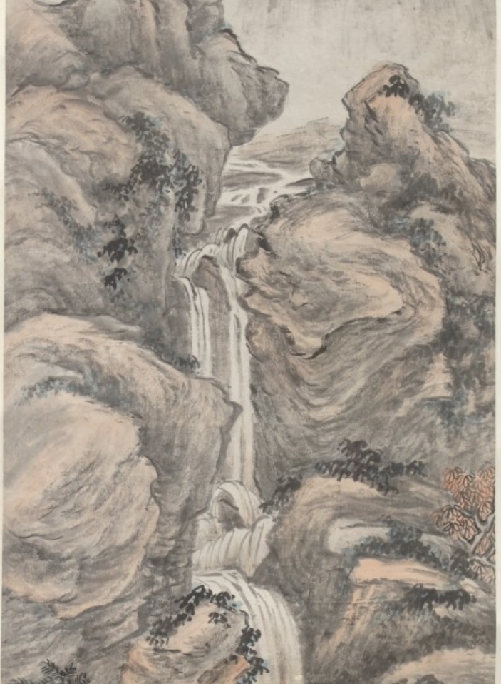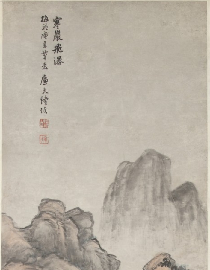 此为晚清至民国时期陆恢创作的《寒岩飞瀑图》轴,属立轴,以纸本水墨设色绘制,图像尺寸 181.6×45.7 厘米。陆恢(1851–1920),原名友恢,江苏苏州人,清末民初画家、鉴赏家,此作以 “寒崖上的瀑布” 为主题,现藏美国大都会博物馆。画作受 14 世纪吴镇 “笔法” 启发,既体现传统笔墨元素,又融入对瀑布光影的自然主义刻画,风格兼具古韵与新意。
