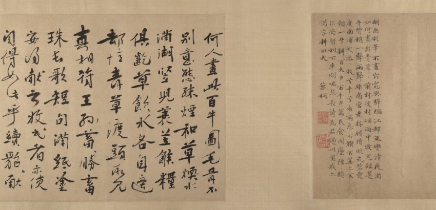 此为 13 世纪南宋至元代佚名画家所作《百牛图》卷,属手卷,以纸本水墨绘制,尺寸 31.8×221.8 厘米,旧传为南宋江参作品,实际创作者未知,以 “一百头水牛” 为主题,现藏美国大都会博物馆。画面绘众多水牛在河道嬉戏、劳作、休憩,牛童牵引或骑牛的场景,展现河乡生活气息,风格贴合宋元时期田园题材绘画特点。