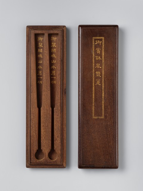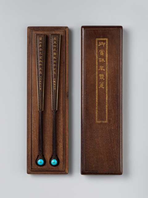 此为清乾隆时期(1736-1795)的山水诗文纸扇一对(含扇盒),创作者未知,现藏美国大都会博物馆。扇子以纸和雪松木为材质,尺寸 31.8×53.3 厘米,主题为山水与诗文,兼具实用与观赏价值,体现了清代乾隆年间扇面艺术的雅致风格。作为当时文人雅士常用的随身器物,这类扇面常集诗、书、画于一体,是研究清代工艺与文人审美结合的实物参考。