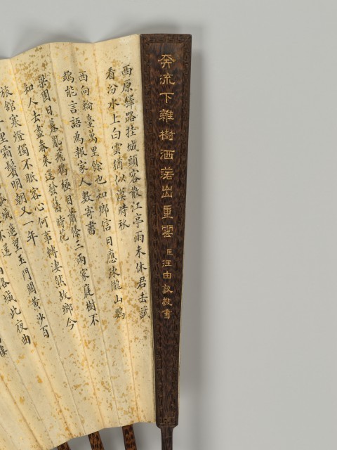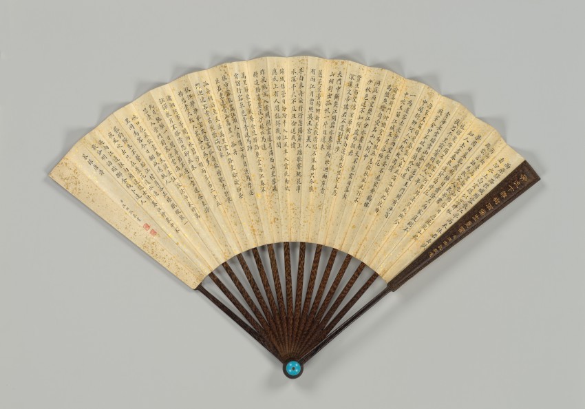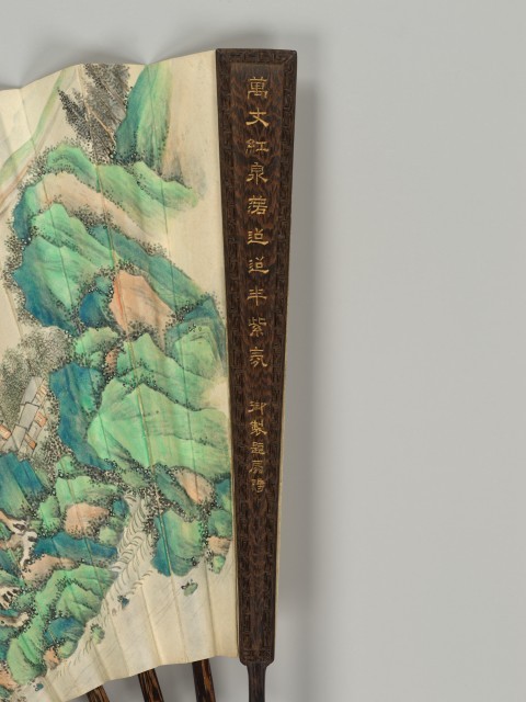 此为清乾隆时期(1736-1795)山水诗文纸扇一对中的其一正面,创作者未知,现藏美国大都会博物馆。扇子以纸和雪松木为材质,尺寸 31.8×53.3 厘米,主题为山水与诗文,属折扇类。扇面作为绘画载体,融合山水景致与诗文题跋,体现了清代乾隆年间扇面艺术 “诗书画合一” 的特点,兼具实用功能与文人审美趣味,是研究清代工艺与文人文化结合的实物参考。