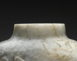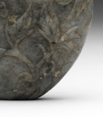 本品规格为4.76 x 4.45 x 2.22 厘米。以玉为材质,整体呈扁圆造型。玉质温润,带有自然纹理与色泽变化。壶身运用浮雕工艺,雕琢出花卉、枝叶等图案,花朵形态古朴,枝叶线条流畅,浮雕层次分明。