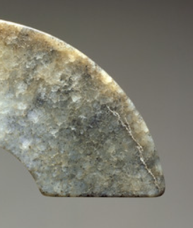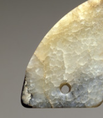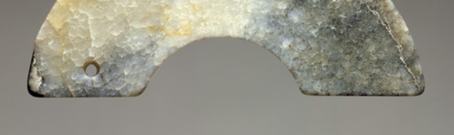 本品规格为4.12 x 9.04 x .47 厘米。以玉为质,呈现出灰白、青灰等自然色泽,表面有斑驳的沁色与纹理,温润中透着岁月沉淀的古朴质感,尽显玉石天然之态 。作弧形璜体,形制规整,边缘线条简洁流畅,一侧有穿孔,便于系佩。