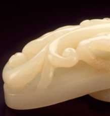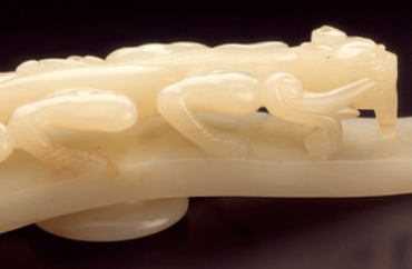 本品规格为3.18 x 12.7 x 3.18 厘米。以温润白玉为材,色泽莹润。带钩一端龙首雕琢精细,五官生动,龙须飘逸;钩身浮雕螭纹,螭龙身形矫健,蜿蜒灵动,与龙首呼应成趣。