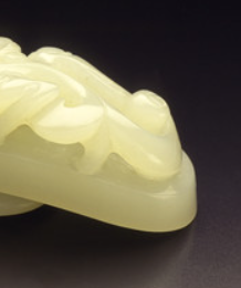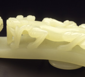 本品规格为3.18 x 13.34 x 2.86 厘米。以温润的黄玉为材质,色泽柔和。带钩造型独特,一端雕琢为龙首,形态生动,线条流畅;钩身浮雕螭纹,螭龙姿态灵动,与龙首呼应,尽显古朴典雅。