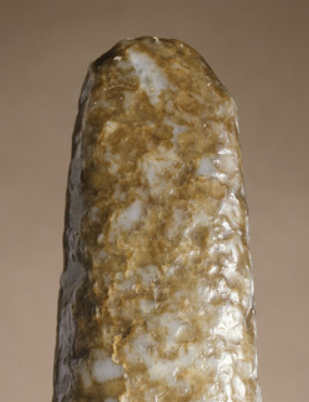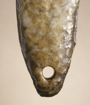 本品规格为15.56 x 3.81 x 1.91 厘米。作长条形,形制简洁,下端有穿孔,便于穿绳佩戴。整体工艺粗犷,保留着早期玉器制作的古朴风格,体现实用与装饰功能的结合,展现古代玉器制作的基础技艺 。