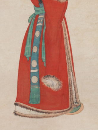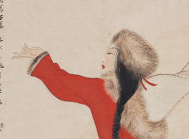 本品规格为图片83.19 x 40.96 厘米,安装189.23 x 54.61 厘米,滚轮59.69厘米。画中仕女身着红装,红袍镶毛边,搭配绿纹腰带,头戴皮帽,造型兼具民族特色与古典韵味。人物双臂舒展,姿态曼妙,面部神态生动,通过细腻笔触刻画,展现出优雅灵动之美,以鲜艳红色为主调,搭配绿色腰带、白色内衬等,色彩对比鲜明却和谐。